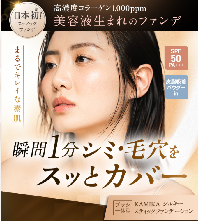 瞬間1分でシミ・毛穴をスッとカバーしてまるできれいな素肌のように仕上がる「KAMIKAシルキースティックファンデーション」。
